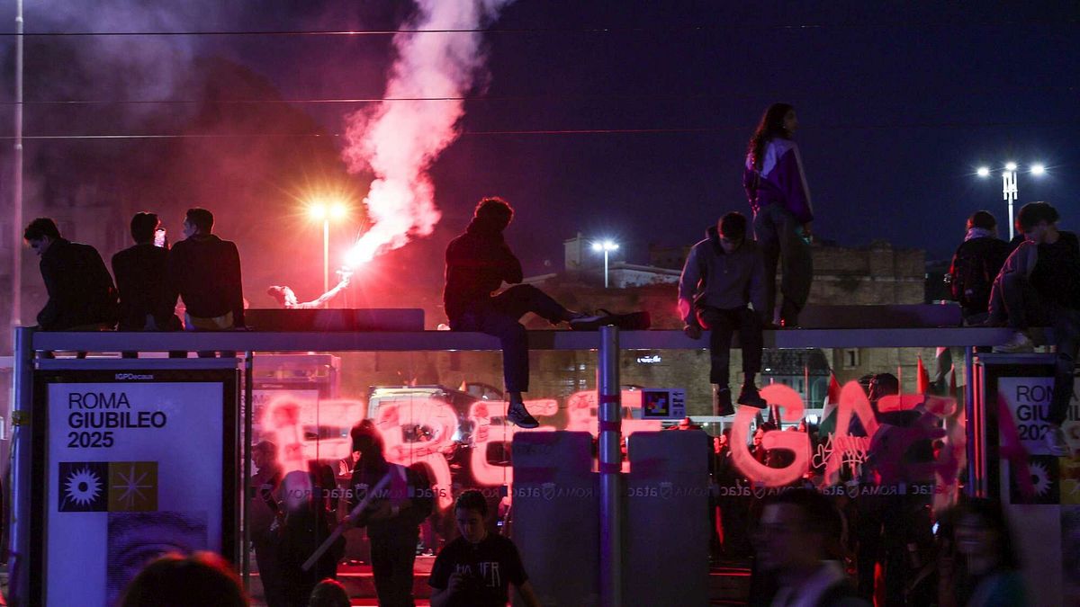 Guerriglia urbana al corteo pro-Pal a Roma | idranti in azione lancio di bottiglie e petardi | Auto della polizia data alle fiamme | I manifestanti | Siamo un milione