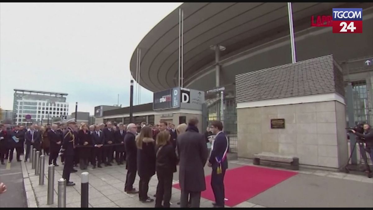 © Tgcom24.mediaset.it - Macron davanti alla lapide della prima vittima dello Stade de France