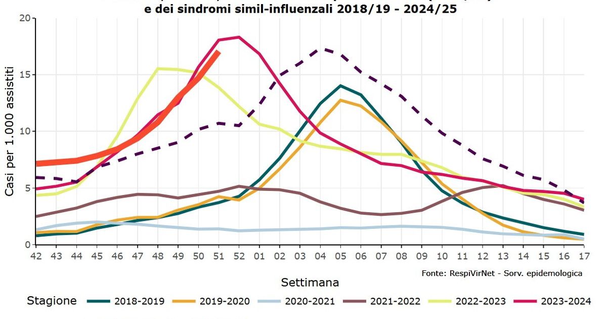 Influenza 2025 e variante K, picco di contagi tra Natale e Capodanno; Infezioni respiratorie. Il picco si avvicina, nell’ultima settimana 817 mila nuovi casi; Super influenza in Italia, verso il picco post-Natale: cosa aspettarsi; Influenza, la variante K mette a letto l'Italia. Il picco atteso tra Natale e Capodanno.
