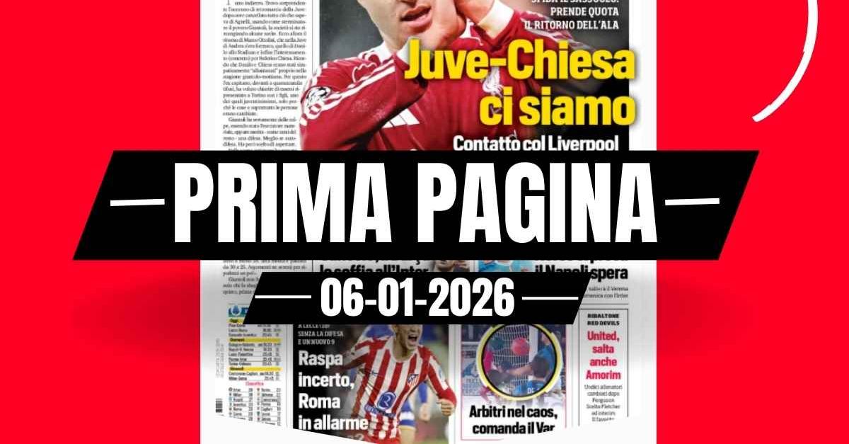 Questa è la prima pagina di 'Corriere dello Sport', in edicola oggi, martedì 6 gennaio 2026. Diamo un’occhiata alle principali novità sul mondo dello sport e in particolare del calcio, cercando di evidenziare le notizie sul Milan. La prima pagina del 'Corriere dello Sport' apre con il calciomercato della Juventus. Il Liverpool apre al ritorno di Chiesa alla Juventus. Cancelo, il Barcellona lo soffia all'Inter. Neres ci prova per l'Inter. Raspadori incerto, la Roma in allarme. Arbitri nel caos, comanda il VAR. Ecco la prima pagina del 'Corriere dello Sport'. 🔗 Leggi su Pianetamilan.it