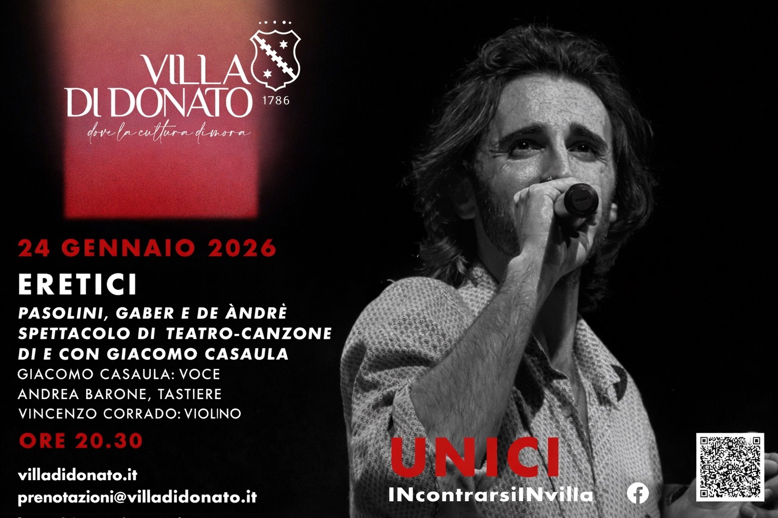 Napoli si prepara ad accogliere una serata di musica, parole e pensiero libero. Venerdì 24 gennaio 2026, alle 20:30, Villa Di Donato ospiterà “Eretici – Pasolini, Gaber e De André”, recital di teatro-canzone diretto e interpretato da Giacomo Casaula, per la prima volta in scena nel capoluogo campano. Nel recital, le tre anime artistiche di Pier Paolo Pasolini, Giorgio Gaber e Fabrizio De André si fondono in un racconto unico, capace di alternare poesia, monologo, canzone e parola civile. Un viaggio che attraversa testi e brani diventati patrimonio collettivo, mantenendo intatta la loro forza dirompente. 🔗 Leggi su 2anews.it