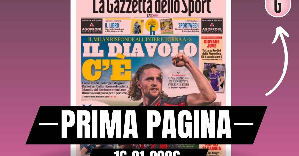 Questa è la prima pagina de 'La Gazzetta dello Sport', in edicola oggi, venerdì 16 gennaio 2026. Diamo un’occhiata alle principali novità sul mondo dello sport e in particolare del calcio, cercando di evidenziare le notizie sul Milan. La prima pagina de 'La Gazzetta dello Sport' apre con la rimonta del Milan sul campo del Como. Il Diavolo c'è. Il Milan risponde all'Inter. Giovane Juve. Tutto su Fortini. Napoli si cambia, c'è En-Nesyri. Pio e papà Chivu. Ecco la prima pagina de 'La Gazzetta dello Sport'. 🔗 Leggi su Pianetamilan.it