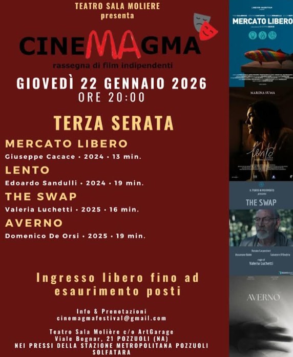 Al Teatro Sala Molière di Pozzuoli arriva la VI edizione di “Cinemagma”Al Teatro Sala Molière di Pozzuoli torna la VI edizione di “Cinemagma”, la rassegna dedicata ai film indipendenti.