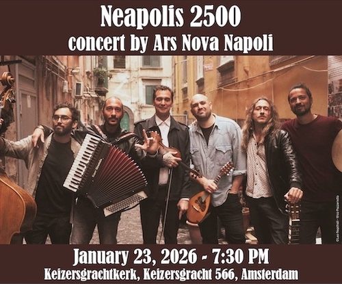 Il “Neapolis 2500 Tour” degli Ars Nova Napoli arriva in Olanda con un concerto esaurito nella suggestiva Keizersgrachtkerk, ospiti dell’Istituto Italiano di Cultura. Il gruppo, sostenuto dal MAECI, si conferma ambasciatore della cultura partenopea e sarà protagonista al prestigioso Babel Music XP 2026 di Marsiglia. Il Neapolis 2500 Tour degli Ars Nova Napoli prosegue il suo cammino internazionale all’insegna del successo e del riconoscimento istituzionale. Il 23 Gennaio il collettivo neo-folk calcherà il palco dello splendido e suggestivo scenario della Keizersgrachtkerk di Amsterdam, per un concerto pre annunciato sold out organizzato dall’Istituto Italiano di Cultura della città. 🔗 Leggi su 2anews.it
