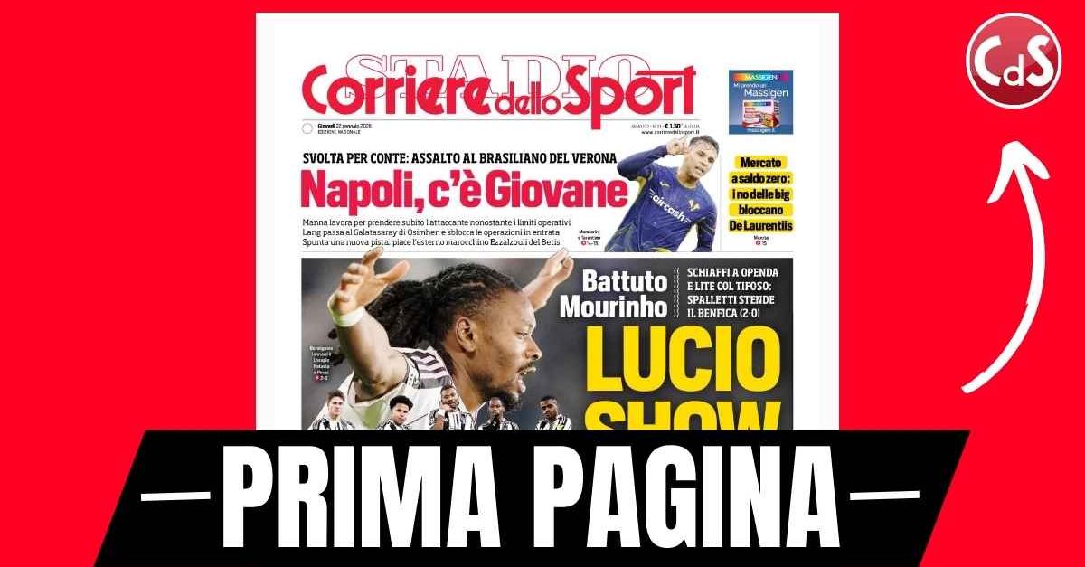 Questa è la prima pagina del 'Corriere dello Sport', in edicola oggi, giovedì 22 gennaio 2026. Diamo un’occhiata alle principali novità sul mondo dello sport e in particolare del calcio, cercando di evidenziare le notizie sul Milan. Il 'Corriere dello Sport' oggi in edicola, in prima pagina, apre con il 2-0 rifilato dalla Juventus di Luciano Spalletti al Benfica di José Mourinho nella partita della 7^ giornata della Fase Campionato della Champions League 2025-2026 disputatasi all'Allianz Stadium. Reti di Khéphren Thuram e Weston McKennie nella ripresa. Show, però, di Spalletti che ha rifilato un ceffone in panchina a Loïs Openda e litigato con un tifoso. 🔗 Leggi su Pianetamilan.it