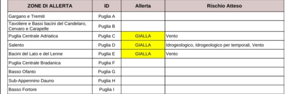 Argomenti discussi: Meteo, temporali e vento forte in tutta la Puglia: scatta l'allerta gialla; Meteo, allerta maltempo per pioggia e neve: regioni a rischio. Le previsioni; Puglia, maltempo: allerta temporali, per il Salento anche vento; Maltempo, allerta meteo arancione e gialla per temporali 22 gennaio 2026: le regioni a rischio.