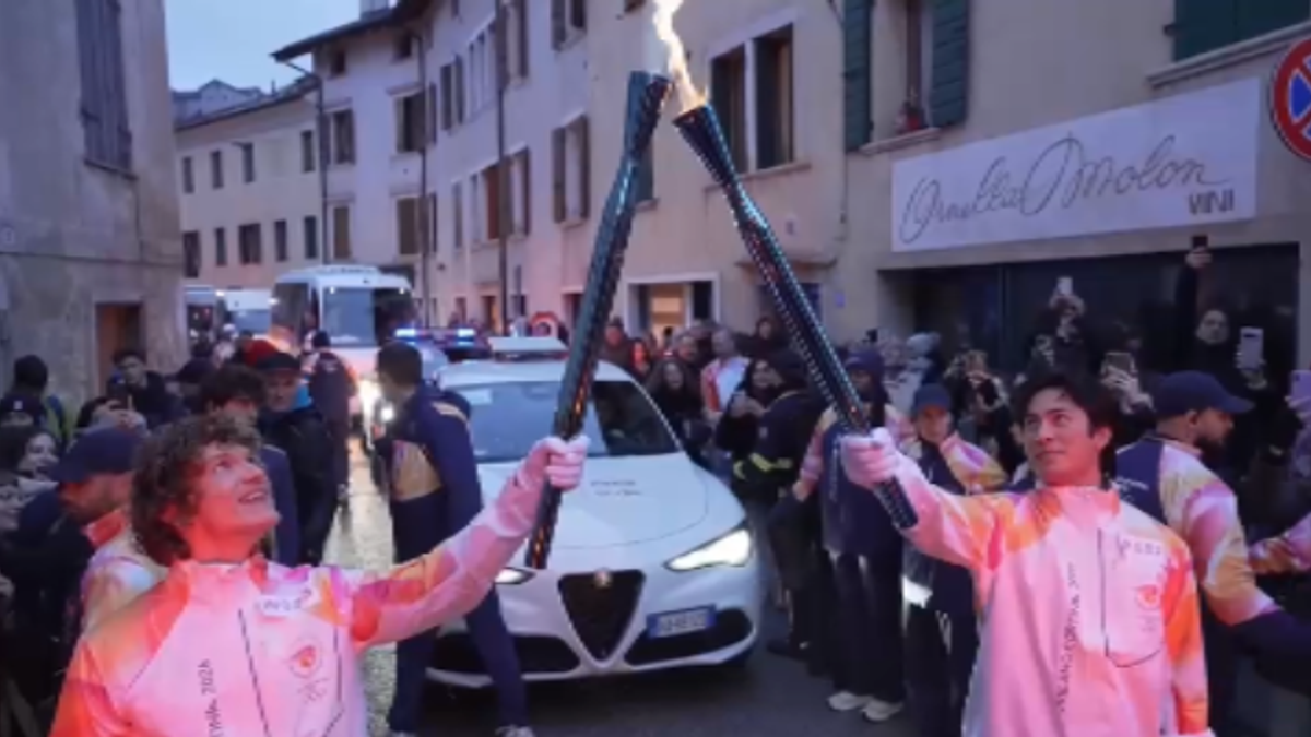 Hudson Williams e Connor Storrie, protagonisti della serie TV ‘Heated Rivalry’, hanno partecipato al passaggio della torcia olimpica a Feltre, in provincia di Belluno.