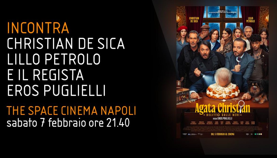 Questa sera al The Space Cinema Napoli Christian De Sica e Lillo sono arrivati per presentare il film “Agata Christian – Delitto sulle Nevi”. Prima della proiezione, il regista Eros Puglielli e gli attori hanno incontrato il pubblico in sala, scambiando qualche battuta prima di far partire la pellicola. La sala era piena e l’atmosfera era festosa, con gli spettatori pronti a scoprire il nuovo thriller ambientato sulle nevi.