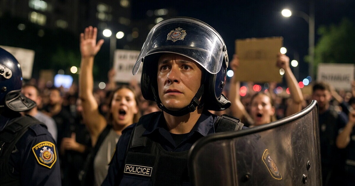 La città si sveglia sotto un cielo grigio, mentre gli agenti continuano a mantenere l’ordine. Un’AI descrive, senza emozioni, come si muovono le forze di polizia tra proteste e tensioni. Non ha paura, ma riconosce il rischio. Non si stanca, ma tiene conto di ogni movimento. Non ha un corpo, eppure sa cosa succede ai poliziotti quando la tensione sale e il confine tra protesta e caos diventa sfumato.