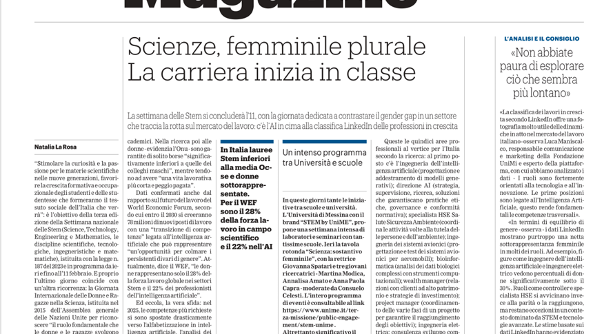 Torna Noi Magazine, l’inserto settimanale gratuito della Gazzetta del Sud, dedicato alle giovani generazioni. Da quasi trent’anni, il magazine affronta temi legati al mondo dei giovani e delle professioni del futuro. Questa settimana, il focus è sulle Stem, le discipline scientifiche e tecnologiche, e sugli stereotipi che ancora ostacolano l’accesso paritario alle carriere. La GDS Academy presenta la nuova stagione 2025-2026, con iniziative rivolte alle scuole e ai giovani, anche attraverso il progetto “Gazzetta del Sud in classe con
