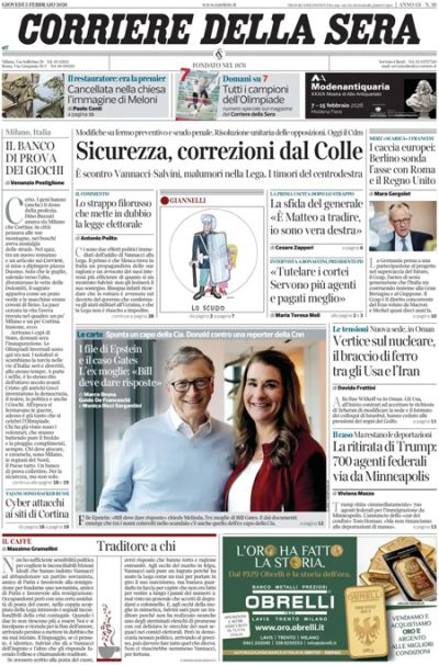 L'incontro fra Mattarella e Mantovano sul decreto "sicurezza", Vannacci e la Lega, e le Olimpiadi invernali di Milano Cortina Sulla maggior parte dei giornali di oggi l’apertura è dedicata all’incontro di ieri al Quirinale fra il presidente della Repubblica Mattarella e il sottosegretario alla presidenza del Consiglio Mantovano sulla costituzionalità delle norme a tema sicurezza che dovrebbero essere inserite nel decreto che il Consiglio dei ministri dovrebbe approvare oggi. La Verità , Libero e il Tempo criticano la scarcerazione delle tre persone arrestate dopo gli scontri durante la manifestazione di sabato scorso a Torino, Avvenire titola sull’avvio delle gare delle Olimpiadi invernali e sull’attesa per la cerimonia inaugurale in programma domani, e il Giornale si occupa della condanna in Ungheria di una militante antifascista in un caso simile a quello dell’europarlamentare italiana Ilaria Salis. 🔗 Leggi su Ilpost.it