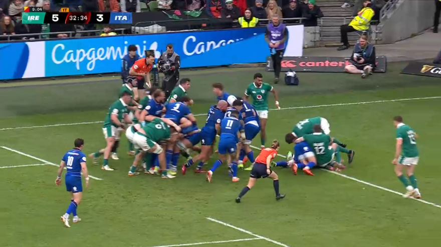 L’Italia segna la prima meta contro l’Irlanda durante la partita dei Sei Nazioni 2026, quando Nicotera sfrutta una maul per portare punti sul tabellone.