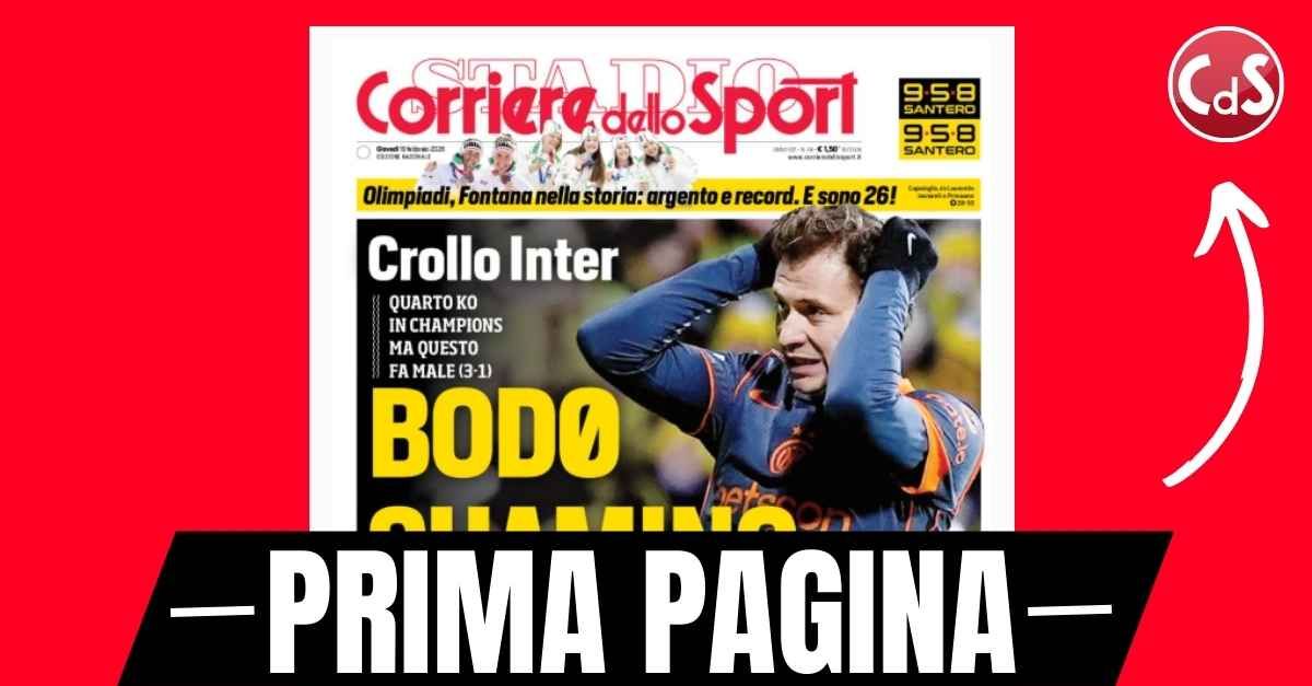 Questa è la prima pagina di 'Corriere dello Sport', in edicola oggi, giovedì 19 febbraio 2026. Diamo un’occhiata alle principali novità sul mondo dello sport e in particolare del calcio, cercando di evidenziare le notizie sul Milan. La prima pagina del 'Corriere dello Sport' apre con il crollo Inter in Champions League. Il Bodo Glimt vince 3-1. Il +7 in campionato sul Milan non consola Chivu. Spalletti non perde Bremer. Prestianni e Vinicius, uno sta mentendo. Bologna attacco con Odgaard. La Viola in Europa con la testa a Pisa. Ecco la prima pagina del 'Corriere dello Sport'.🔗 Leggi su Pianetamilan.it