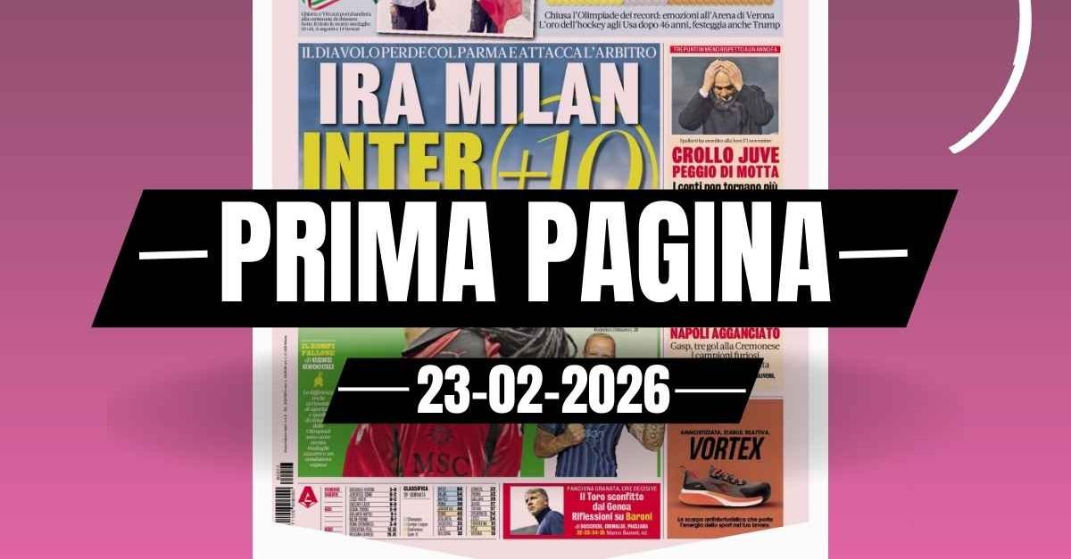 Questa è la prima pagina de 'La Gazzetta dello Sport', in edicola oggi, lunedì 23 febbraio 2026. Diamo un’occhiata alle principali novità sul mondo dello sport e in particolare del calcio, cercando di evidenziare le notizie sul Milan. 'La Gazzetta dello Sport' oggi in edicola, in prima pagina, apre parlando di Milan-Parma, partita della 26^ giornata della Serie A 2025-2026 terminata 0-1 per gli ospiti. Rete decisiva, all'80', di Mariano Troilo. Un gol viziato da due falli: un blocco irregolare di Lautaro Valenti sul portiere rossonero, Mike Maignan e un salto a due mani dell'autore del gol su Davide Bartesaghi per andare a prendere il pallone di testa. 🔗 Leggi su Pianetamilan.it