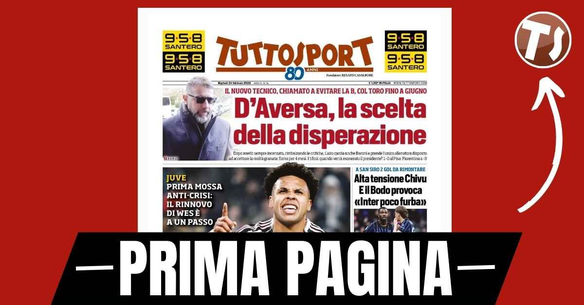 Questa è la prima pagina di 'Tuttosport', in edicola oggi, martedì 24 febbraio 2026. Diamo un’occhiata alle principali novità sul mondo dello sport e in particolare del calcio, cercando di evidenziare le notizie sul Milan. 'Tuttosport' oggi in edicola, in prima pagina, apre con l'accordo trovato tra la Juventus e Weston McKennie per il rinnovo del centrocampista statunitense fino al 30 giugno 2030. Spiragli anche per il prolungamento dell'accordo con Dušan Vlahovic. Domani, alle ore 21:00, spazio al ritorno dei playoff di Champions League all'Allianz Stadium contro il Galatasaray: non dovrebbe farcela Gleison Bremer, mentre sarà presente Kenan Yildiz. 🔗 Leggi su Pianetamilan.it