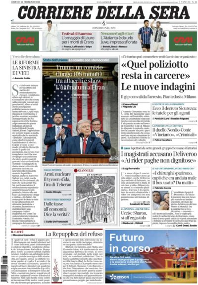 L'indagine sui fattorini di Deliveroo, il discorso sullo stato dell'Unione di Trump, il festival di Sanremo, e il referendum "sulla giustizia" Le notizie principali in apertura sui giornali di oggi sono il discorso sullo stato dell’Unione del presidente degli Stati Uniti Trump, che ha esaltato le politiche della sua amministrazione e la situazione economica del paese, l’indagine della procura di Milano che ha messo sotto controllo giudiziario la società di consegne di cibo a domicilio Deliveroo, accusata di sfruttamento dei rider, e la campagna in vista del referendum “sulla giustizia”, in programma il 22 e il 23 marzo. Il Corriere... 🔗 Leggi su Ilpost.it