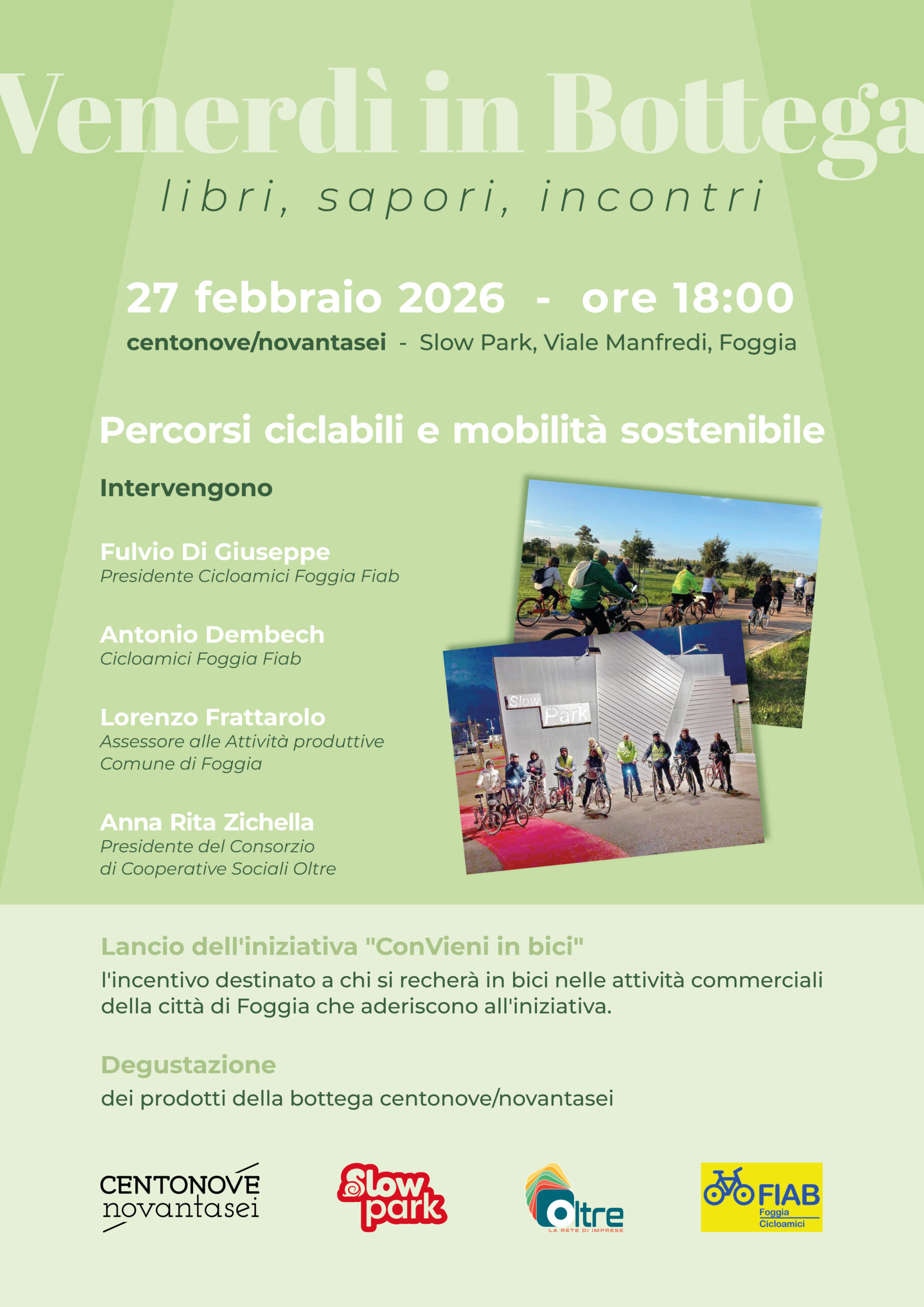 Di seguito un comunicato diffuso da Rete Oltre: “Percorsi ciclabili e mobilità sostenibile”. Sono questi i temi al centro dell’incontro organizzato nell’ambito dei tradizionali “Venerdì in Bottega” in programma a Foggia venerdì 27 febbraio 2026, alle ore 18.00, nella bottega-cucina “centonovenovantasei”, allo Slow Park in viale Manfredi, in collaborazione con l’associazione Cicloamici Foggia Fiab. Un’occasione per raccontare, diffondere e valorizzare i percorsi ciclabili che attraversano la città, i suoi luoghi, le sue bellezze turistiche e culturali. Come il tour dei murales, dell’Edicole votive, del verde urbano, dei parchi, dei Palazzi storici, delle chiese, fino a raggiungere in gruppo anche le mostre artistiche esposte. 🔗 Leggi su Noinotizie.it