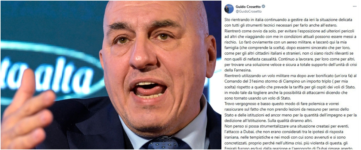 Bloccato dalla guerra Crosetto rientra a sue spese da Dubai e asfalta la sinistra | Vergogna