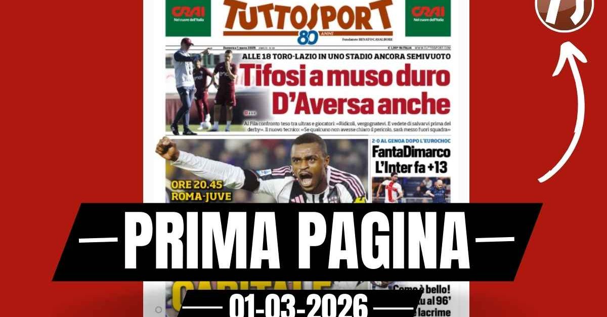 Questa è la prima pagina del 'Tuttosport', in edicola oggi, domenica primo marzo 2026. Diamo un’occhiata alle principali novità sul mondo dello sport e in particolare del calcio, cercando di evidenziare le notizie sul Milan. La prima pagina di 'Tuttosport' apre con spareggio tra Juventus e Roma, sentenza capitale. Tifosi a muso duro. D'Aversa anche. FantDimarco. L'Inter fa più 13. Domenica il derby. Milan oggi la Cremonese. Ecco la prima pagina di 'Tuttosport'. 🔗 Leggi su Pianetamilan.it