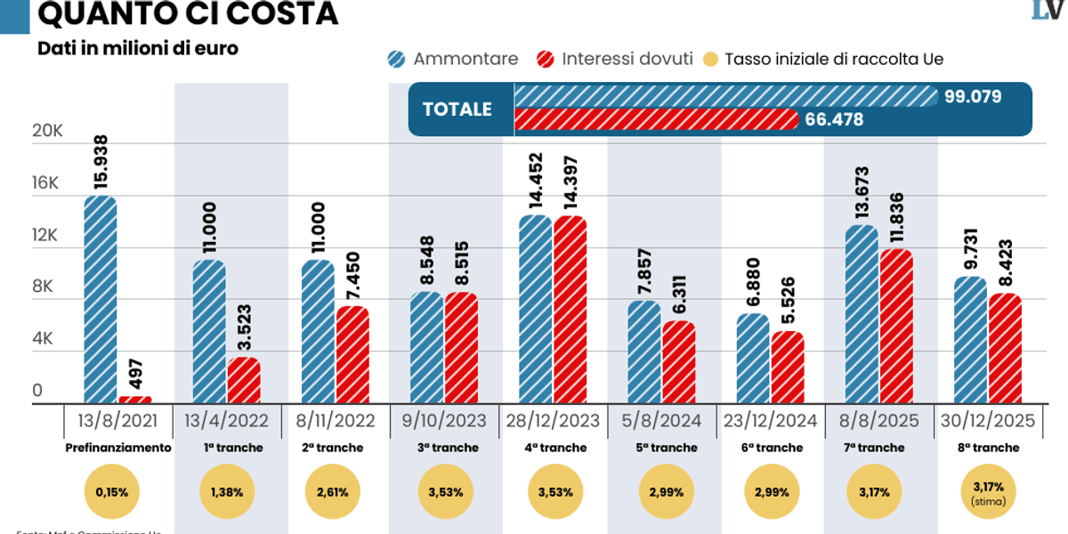 Nei giorni in cui il Btp Valore si avvia a raccogliere in scioltezza 15 miliardi tra i piccoli risparmiatori, salta ancor più agli occhi la spesa per interessi per i 99 miliardi (che saliranno a 123 entro fine anno) di prestiti per il Pnrr. Qualche giorno fa vi avevamo prudenzialmente parlato di 60 miliardi, ma applicando in modo certosino i tassi di raccolta sostenuti dalla Ue per le singole rate, il contatore è salito a circa 66,4 miliardi, spalmati tra agosto 2021, quando è stata incassata la rata di anticipo, e 2057, quando terminerà il rimborso delle ultime due rate che probabilmente incasseremo nel 2026. La seconda cattiva notizia è... 🔗 Leggi su Laverita.info
