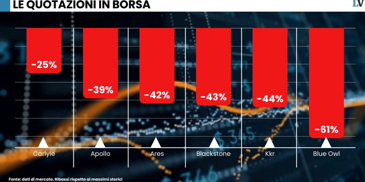 Negli Stati Uniti torna a preoccupare il settore finanziario con segnali di instabilità. BlackRock ha deciso di azzerare un prestito e i mercati azionari hanno registrato cali fino al 61% rispetto ai massimi. Nei fondi privati sono triplicati i rimborsi, mentre i fidi bancari in bilico raggiungono i 1.4 trilioni di dollari.