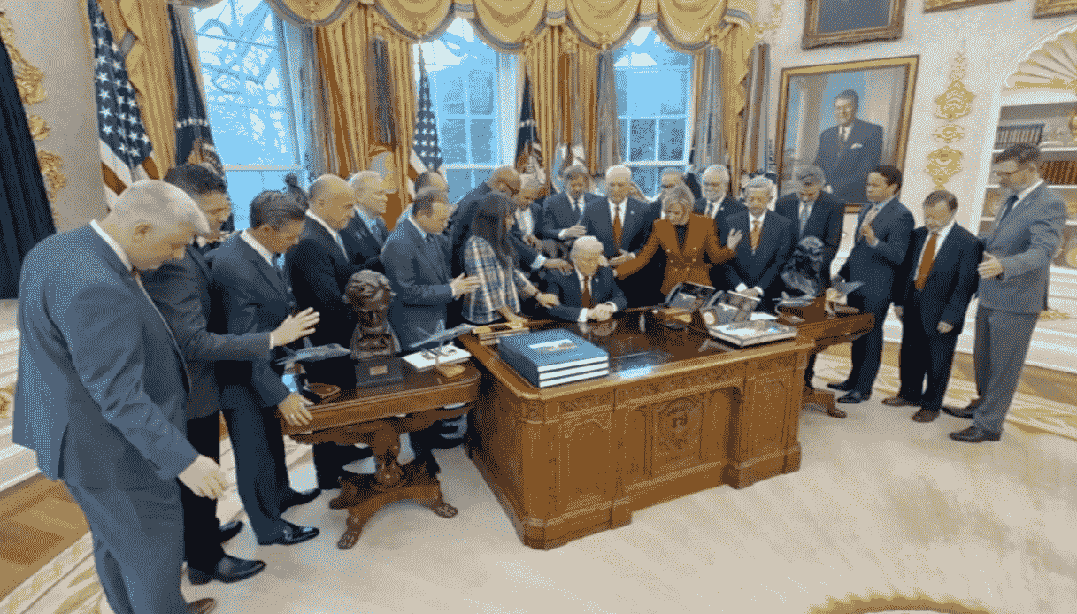Nella Sala Ovale della Casa Bianca, un gruppo di pastori evangelici si è riunito per pregare, chiedendo protezione e guida divina per il presidente. Il video mostra le preghiere rivolte a Dio, con l’intervento di religiosi che si sono rivolti al cielo in sua vece. Nessuna altra persona è coinvolta e la scena si svolge all’interno degli ambienti ufficiali della residenza presidenziale.