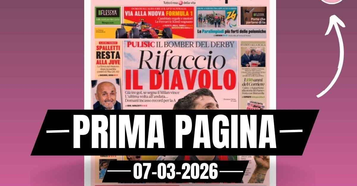 Questa è la prima pagina de 'La Gazzetta dello Sport', in edicola oggi, sabato 7 marzo 2026. Diamo un’occhiata alle principali novitĂ sul mondo dello sport e in particolare del calcio, cercando di evidenziare le notizie sul Milan. La prima pagina de 'La Gazzetta dello Sport' apre con il derby tra Milan e Inter. Pulisic il bomber del Derby. Rifaccio il Diavolo. Spalletti resta alla Juve. L'intervista a Vieri. Il Napoli batte il Torino. Ecco la prima pagina de 'La Gazzetta dello Sport'. 🔗 Leggi su Pianetamilan.it