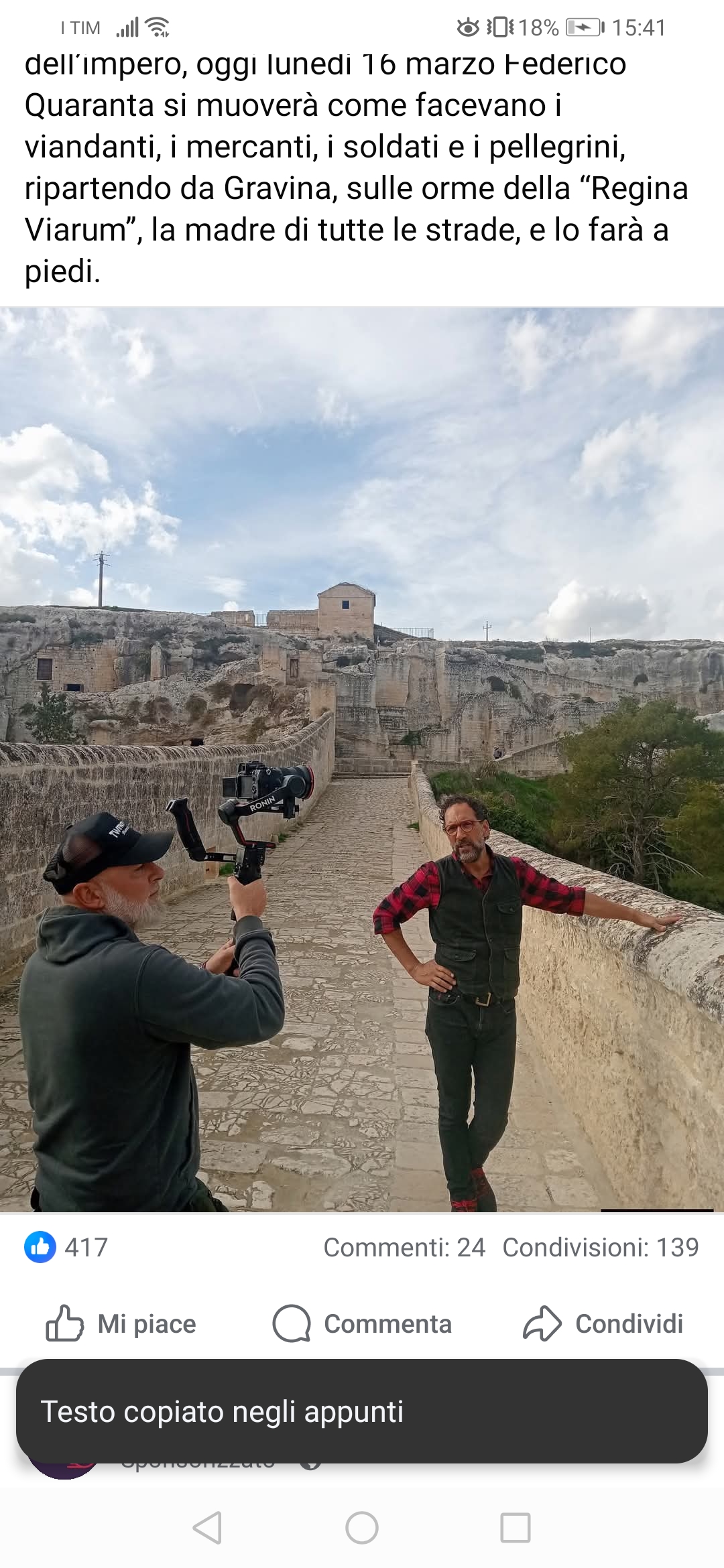 Di seguito un comunicato, corredato da foto, diffuso dal Comune di Gravina in Puglia: Si allunga di una settimana il viaggio de “Il Provinciale” su Rai3 con alcune puntate inedite che da lunedì 16, stasera a venerdì 20 marzo, alle 20.10, racconteranno le storie e i luoghi più autentici della provincia italiana, in particolare della Via Appia in Puglia, a cominciare dalla nostra Città. Camminare appartiene all’uomo da sempre: è un gesto primordiale, tenace, capace di riconnettere ciò che la vita spesso divide. Sul tratto pugliese dell’Appia antica, la strada che Roma tracciò come spina dorsale dell’impero, oggi lunedì 16 marzo Federico Quaranta si muoverà come facevano i viandanti, i mercanti, i soldati e i pellegrini, ripartendo da Gravina, sulle orme della “Regina Viarum”, la madre di tutte le strade, e lo farà a piedi. 🔗 Leggi su Noinotizie.it