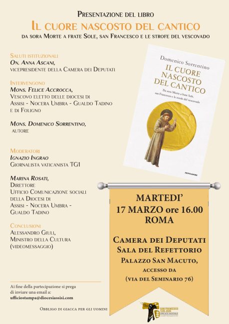 Martedì 17 marzo alle 16, presso la Sala del Refettorio di Palazzo San Macuto, si terrà la presentazione del libro “Il cuore nascosto del Cantico” scritto da monsignor Domenico Sorrentino. L’evento coinvolge un pubblico interessato alla pubblicazione, che affronta temi legati a figure religiose e alle strofe del vescovado. La presentazione si svolge in un luogo storico nel centro di Roma.