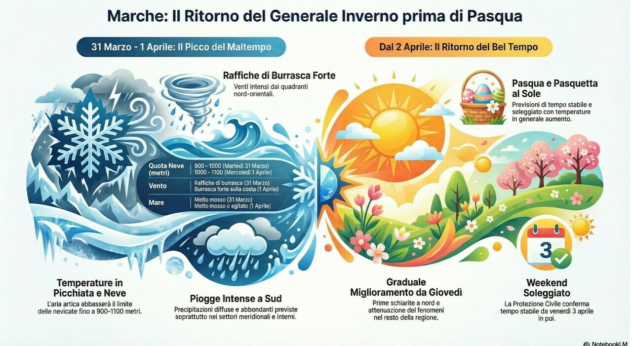 In queste ore, le Marche sono interessate da un fronte di maltempo che ha portato vento forte e nevicate. La perturbazione, di origine artico-marittima, ha causato burrasche e condizioni di pieno inverno. Nei prossimi giorni, il tempo dovrebbe migliorare con l'arrivo di condizioni piĂą stabili in vista della Pasqua.