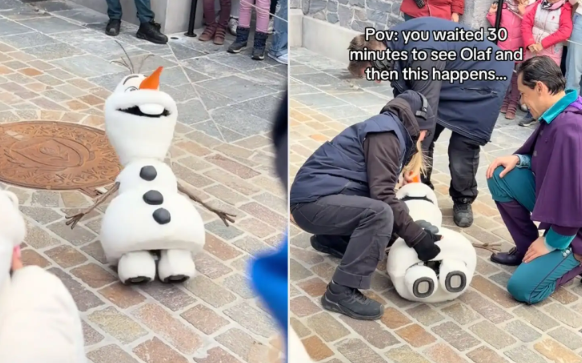È appena morto Olaf Non avevo mai visto la vita lasciare gli occhi di un pupazzo così | il video dello schianto a terra del pupazzo di neve versione animatronic è virale