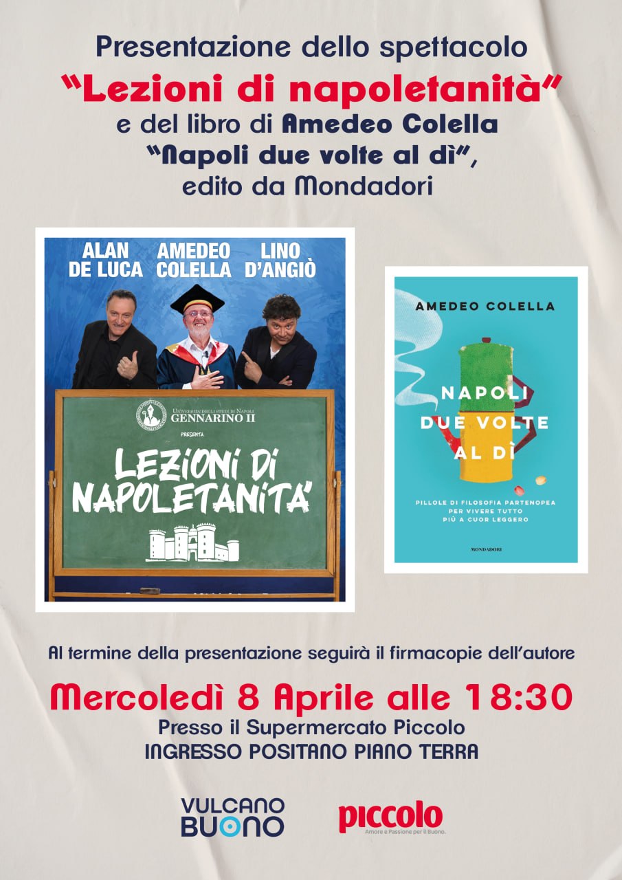 Al Vulcano Buono si è svolta una presentazione legata alla cultura napoletana, con Amedeo Colella che ha illustrato il suo spettacolo “Lezioni di Napoletanità” e il libro “Due volte al dì”. L’evento si è tenuto presso il punto vendita dei Supermercati Piccolo, offrendo l’opportunità di conoscere da vicino aspetti legati alla tradizione locale. La manifestazione ha coinvolto un pubblico interessato alla cultura partenopea.