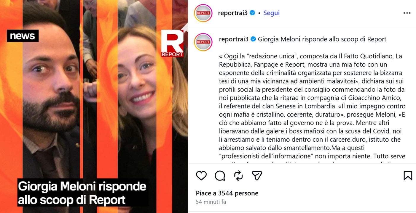Giorgia #Meloni anziché rispondere alla domanda, sollevata grazie ad una notizia pubblicata da Report (il pezzo va in onda il 12 aprile su Rai3) sul perché la premier abbia una foto con tale Gioacchino Amico, referente del clan Senese in Lombardia e oggi c x.com