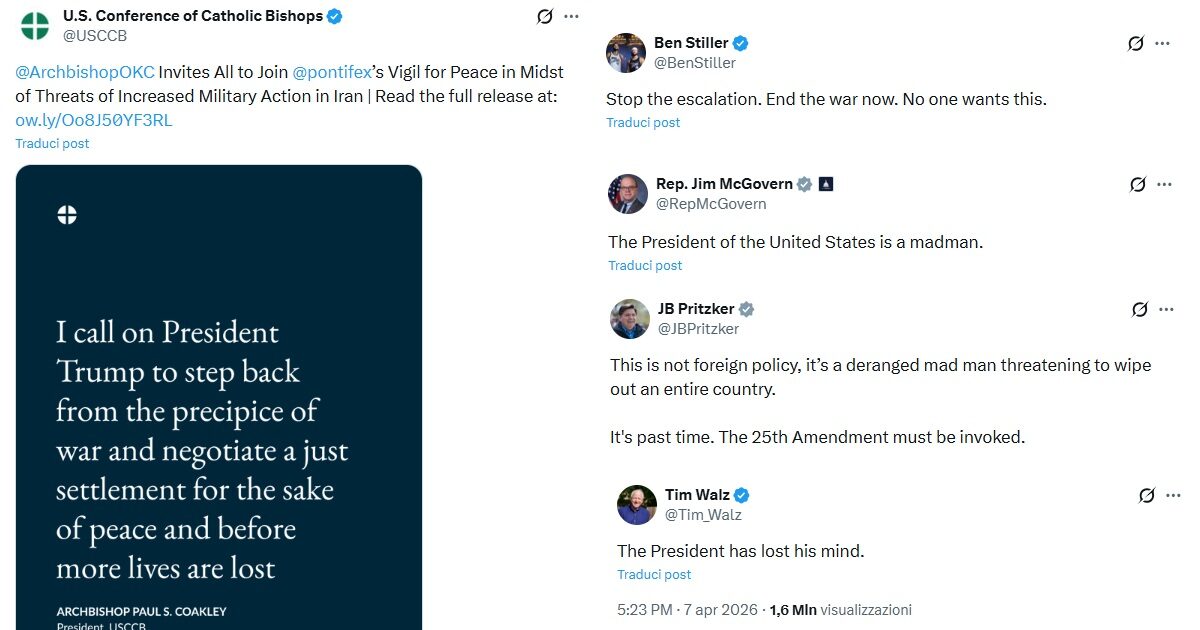 Negli ultimi giorni sui social si sono moltiplicati commenti e commenti di figure pubbliche di varia provenienza in merito a Donald Trump. Politici, attori e il capo dei vescovi negli Stati Uniti hanno espresso giudizi duri, definendo l’ex presidente “malato” e “pazzo”. Alcune dichiarazioni si sono concentrate sulle sue minacce di azioni contro il popolo iraniano, invitando a prendere sul serio il suo comportamento.