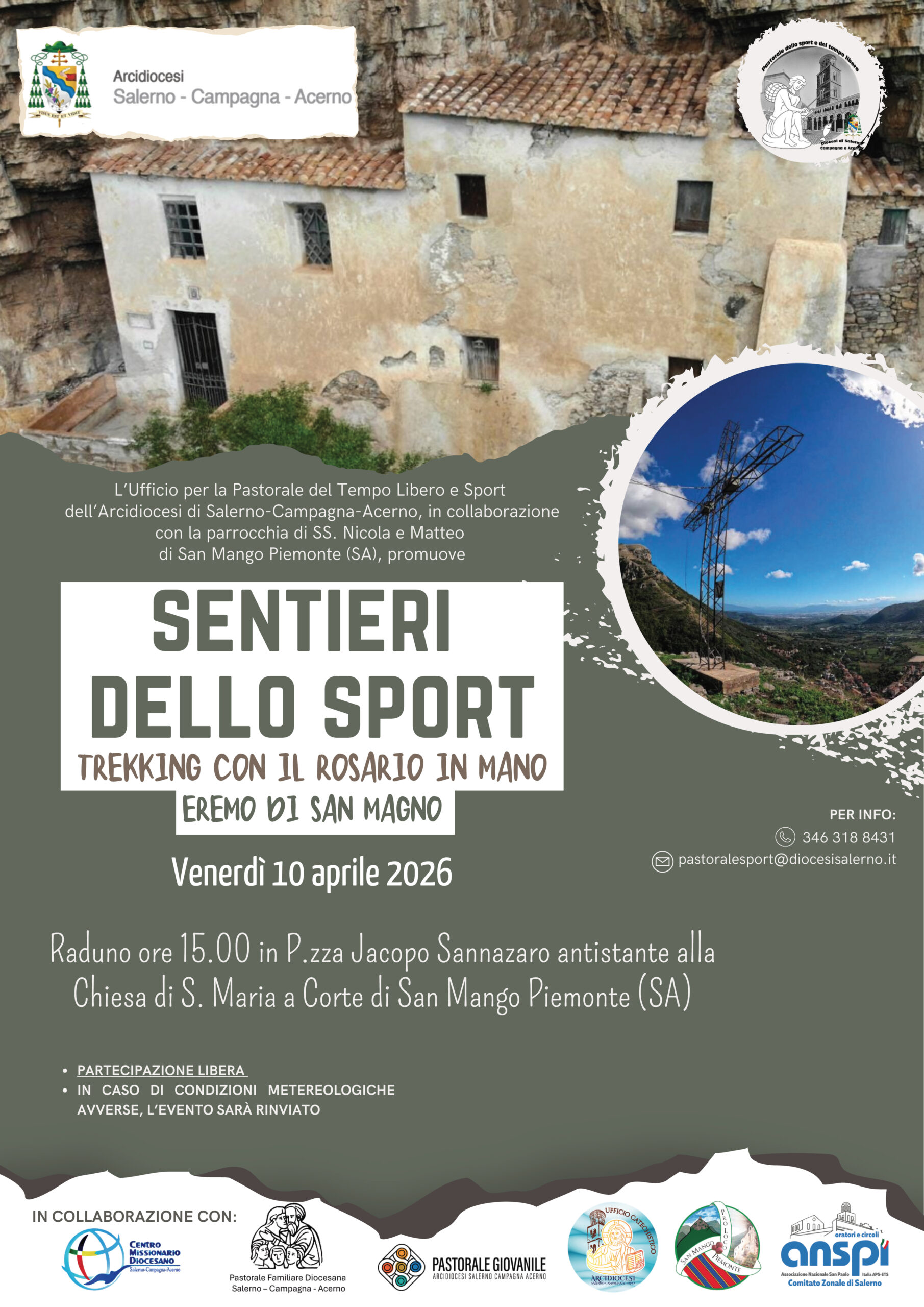 Un’iniziativa che unisce sport, natura e spiritualità: è in programma per venerdì 10 aprile alle ore 15 “ Sentieri dello sport – Trekking con il Rosario in mano ”, con partenza da San Mango Piemonte e arrivo presso il suggestivo Eremo di San Magno. L’evento è promosso dall’ Ufficio per la Pastorale del Tempo Libero e Sport dell’Arcidiocesi di Salerno-Campagna-Acerno, in collaborazione con diverse realtà del territorio, tra cui la Parrocchia di SS. Nicola e Matteo, il Centro Missionario Diocesano, la Pastorale Familiare, la Pastorale Giovanile, l’Ufficio Catechistico, la Pro Loco di San Mango e l’Anspi (Comitato Zonale di Salerno). Un percorso tra natura e spiritualità. 🔗 Leggi su Zon.it