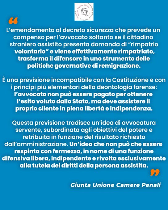 Di seguito il comunicato dell’Unione camere penali italiane: L’emendamento al decreto sicurezza che prevede un compenso per l’avvocato soltanto se il cittadino straniero assistito presenta domanda di “rimpatrio volontario” e viene effettivamente rimpatriato, trasforma il difensore in uno strumento delle politiche governative di remigrazione. È una previsione incompatibile con la Costituzione e con i principi più elementari della deontologia forense: l’avvocato non può essere pagato per ottenere l’esito voluto dallo Stato, ma deve assistere il proprio cliente in piena libertà e indipendenza. Questa previsione tradisce un’idea di avvocatura servente, subordinata agli obiettivi del potere e retribuita in funzione del risultato richiesto dall’amministrazione.🔗 Leggi su Noinotizie.it