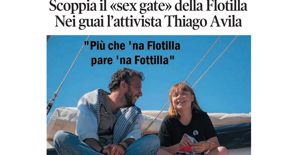 La vignetta di Osho sulla prima pagina de Il Tempo di lunedì 20 aprile 2026. Dal war movie alla commedia sexy in acque internazionali: un repentino cambio di genere. Altro che Flotilla, piuttosto un sequel di Love Boat, la famosissima serie americana a cavallo tra gli anni '70 e '80. Il velo viene impietosamente squarciato da un reportage del New York Post: la «Flotilla della libertà» di Greta Thunberg, partita domenica da Barcellona per un altro viaggio anti-Israele verso Gaza, è stata scossa da uno scandalo a luci rosse. In pratica, uno dei suoi leader «woke», il brasiliano Thiago Ávila, è stato accusato di «comportamento sessuale scorretto» a danno di almeno tre volontarie.🔗 Leggi su Iltempo.it
