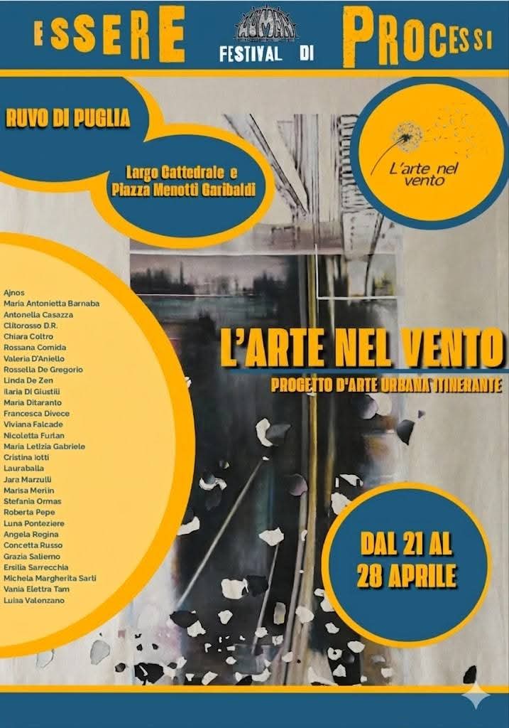 Da oggi a Ruvo di Puglia è possibile vedere un’installazione urbana intitolata “L’arte nel vento”. La mostra è stata allestita in uno spazio pubblico della città ed è visibile a tutti i passanti. La locandina dell’evento mostra i dettagli dell’opera e la data di inaugurazione. La manifestazione rimarrà allestita nelle prossime settimane, offrendo un’opportunità di osservare un esempio di arte urbana.