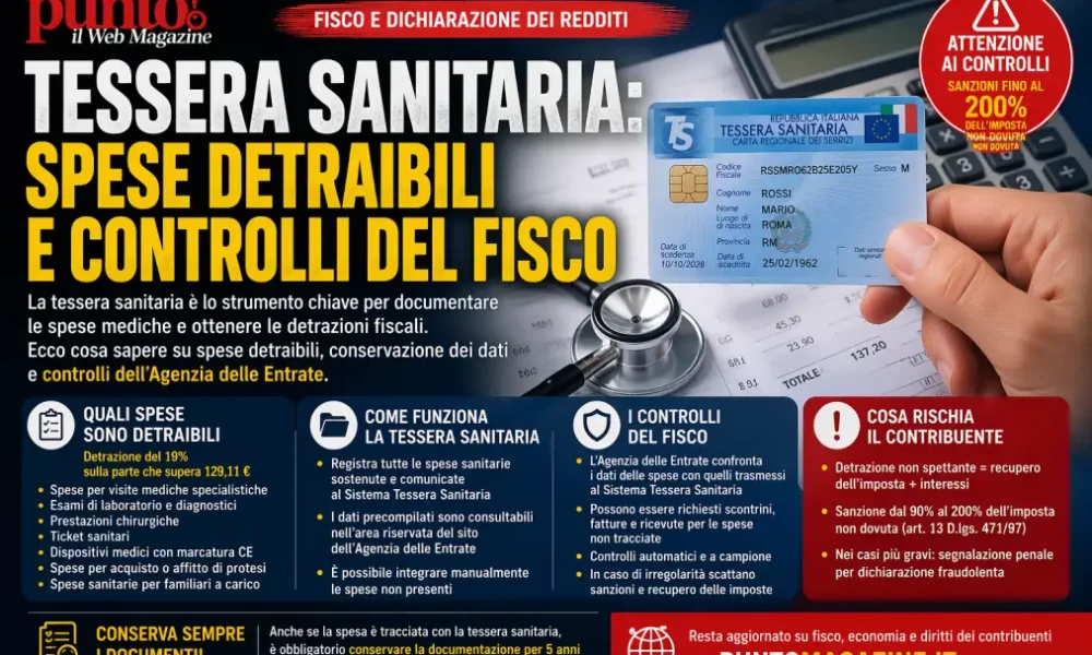 Dalla dichiarazione dei redditi ai controlli dell’Agenzia delle Entrate: cosa sapere su tessera sanitaria, detrazioni e verifiche fiscali.. Tessera sanitaria: a cosa serve davvero. La tessera sanitaria è uno strumento fondamentale per il cittadino italiano: oltre a identificare l’assistito nel Servizio Sanitario Nazionale, consente di tracciare le spese sanitarie sostenute. Questi dati vengono trasmessi al Sistema Tessera Sanitaria e utilizzati dall’Agenzia delle Entrate per la predisposizione della dichiarazione dei redditi precompilata. Spese detraibili con la tessera sanitaria. Le spese sanitarie registrate tramite tessera sanitaria possono essere portate in detrazione al 19% nella dichiarazione dei redditi, oltre la franchigia prevista dalla normativa.🔗 Leggi su Puntomagazine.it