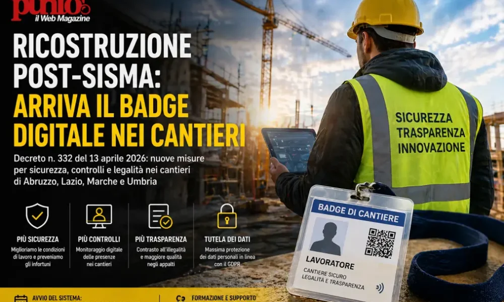 Decreto n. 332 del 13 aprile 2026: monitoraggio digitale delle presenze e nuove misure per legalità, sicurezza e trasparenza nei cantieri di Abruzzo, Lazio, Marche e Umbria. Alle lettrici e ai lettori di PuntoMagazine, la Presidenza del Consiglio dei Ministri ha emanato il Decreto n. 332 del 13 aprile 2026, firmato dal Commissario Straordinario del Governo per la ricostruzione nei territori colpiti dagli eventi sismici del Centro Italia (Abruzzo, Lazio, Marche e Umbria). Il provvedimento introduce nuove disposizioni in materia di controllo, sicurezza e innovazione nei cantieri, con particolare riferimento all’adozione del badge digitale di cantiere.🔗 Leggi su Puntomagazine.it