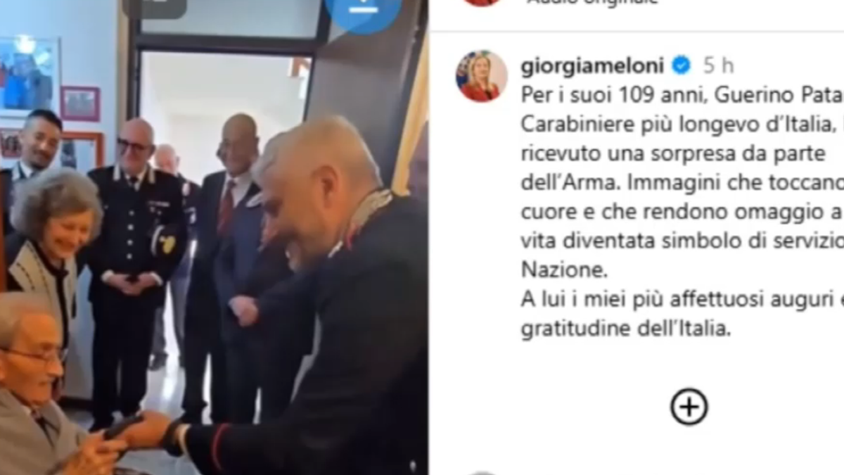 Leggi anche: Carabiniere più longevo compie 109 anni, premier Meloni pubblica video della sorpresa dell'Arma