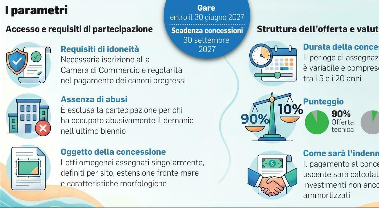 Le autorità pubblicano un nuovo bando per la gestione delle spiagge, con le concessioni che potranno durare fino a venti anni. Le gare di assegnazione devono essere pubblicate dai Comuni entro il 30 giugno 2027, secondo le regole stabilite nel documento tipo. La procedura riguarda diverse aree balneari, alcune delle quali già occupate da stabilimenti balneari noti, mentre altre sono in attesa di assegnazione.