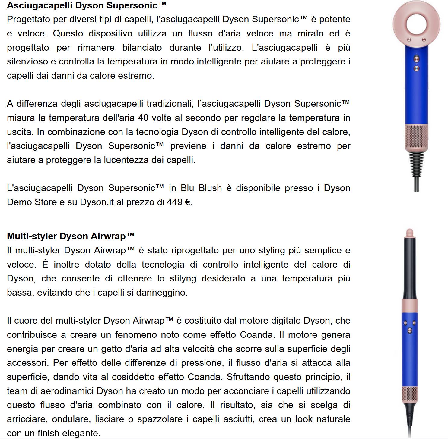 Emma Sheldon, Vice President di CMF Design, afferma: "I prodotti Dyson hanno sempre avuto una particolare attenzione nei confronti del colore, lo celebriamo e continuiamo ad evolverci. Lo sviluppo di questa nuova edizione mostra anche la sperimentazione dei designer Dyson CMF nelle finiture oltre che nel colore, con lo sviluppo del rivestimento superiore a effetto "ceramica" che sfida le convenzioni del moderno design di lusso. L'audace e moderno blu, completato dal morbido rosa, è una combinazione perfetta per Dyson, che mette in evidenza l'innovazione e la bellezza della nostra gamma di prodotti per la cura dei capelli".