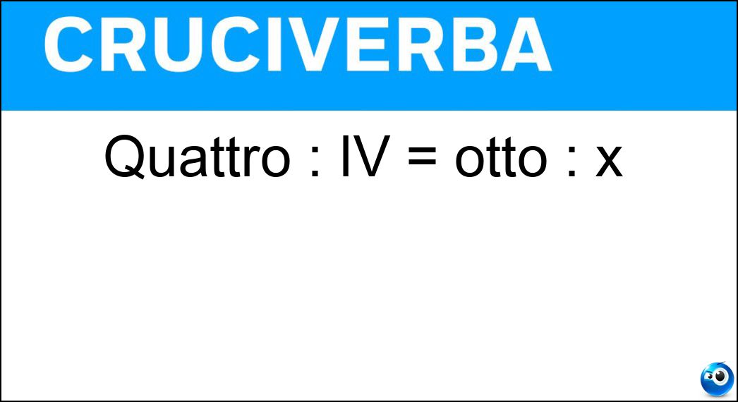 Nei cruciverba e nelle parole crociate, la definizione "Quattro : IV = otto : x" corrisponde a una soluzione formata da 4 lettere. È un quesito ricorrente nel mondo dell’enigmistica, presente con frequenza sia nelle griglie stampate sia nei giochi digitali dedicati agli appassionati.