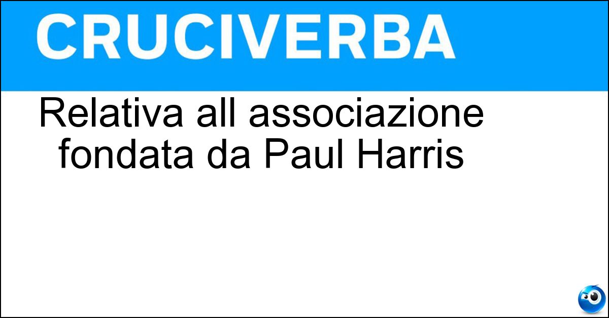 La definizione "Relativa all associazione fondata da Paul Harris", utilizzata nei cruciverba e nelle parole crociate, ha una soluzione composta da 9 lettere. Si tratta di un enigma piuttosto comune, che ricorre spesso sia nei giochi cartacei sia nelle versioni digitali dedicate agli appassionati di enigmistica.
