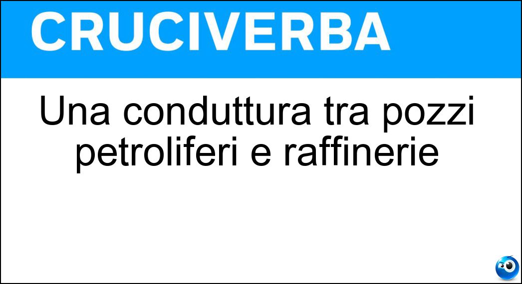 La definizione "Una conduttura tra pozzi petroliferi e raffinerie", utilizzata nei cruciverba e nelle parole crociate, ha una soluzione composta da 8 lettere. Si tratta di un enigma piuttosto comune, che ricorre spesso sia nei giochi cartacei sia nelle versioni digitali dedicate agli appassionati di enigmistica.