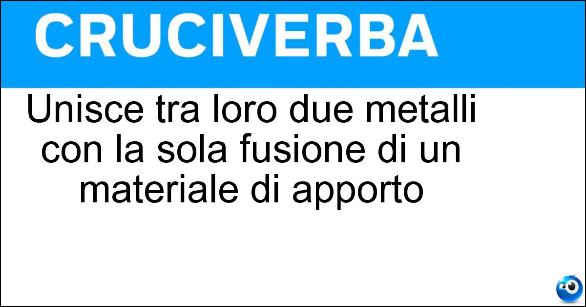 La definizione "Unisce tra loro due metalli con la sola fusione di un materiale di apporto", utilizzata nei cruciverba e nelle parole crociate, ha una soluzione composta da 14 lettere. Si tratta di un enigma piuttosto comune, che ricorre spesso sia nei giochi cartacei sia nelle versioni digitali dedicate agli appassionati di enigmistica.