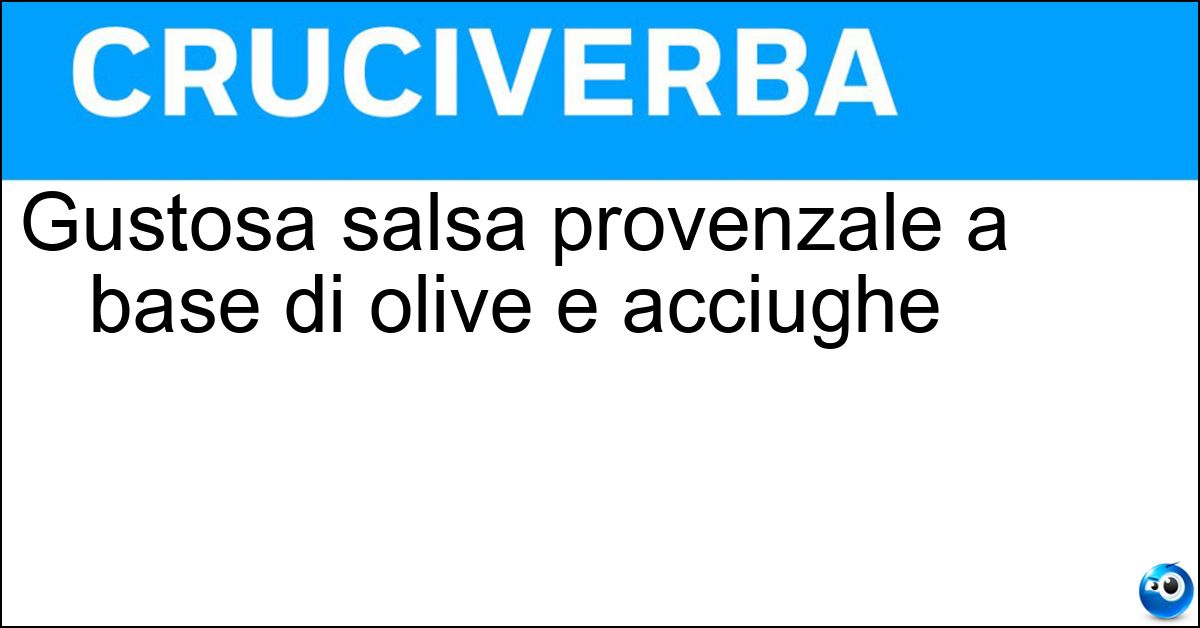 Nei cruciverba e nelle parole crociate, la definizione "Gustosa salsa provenzale a base di olive e acciughe" corrisponde a una soluzione formata da 8 lettere. È un quesito ricorrente nel mondo dell’enigmistica, presente con frequenza sia nelle griglie stampate sia nei giochi digitali dedicati agli appassionati.