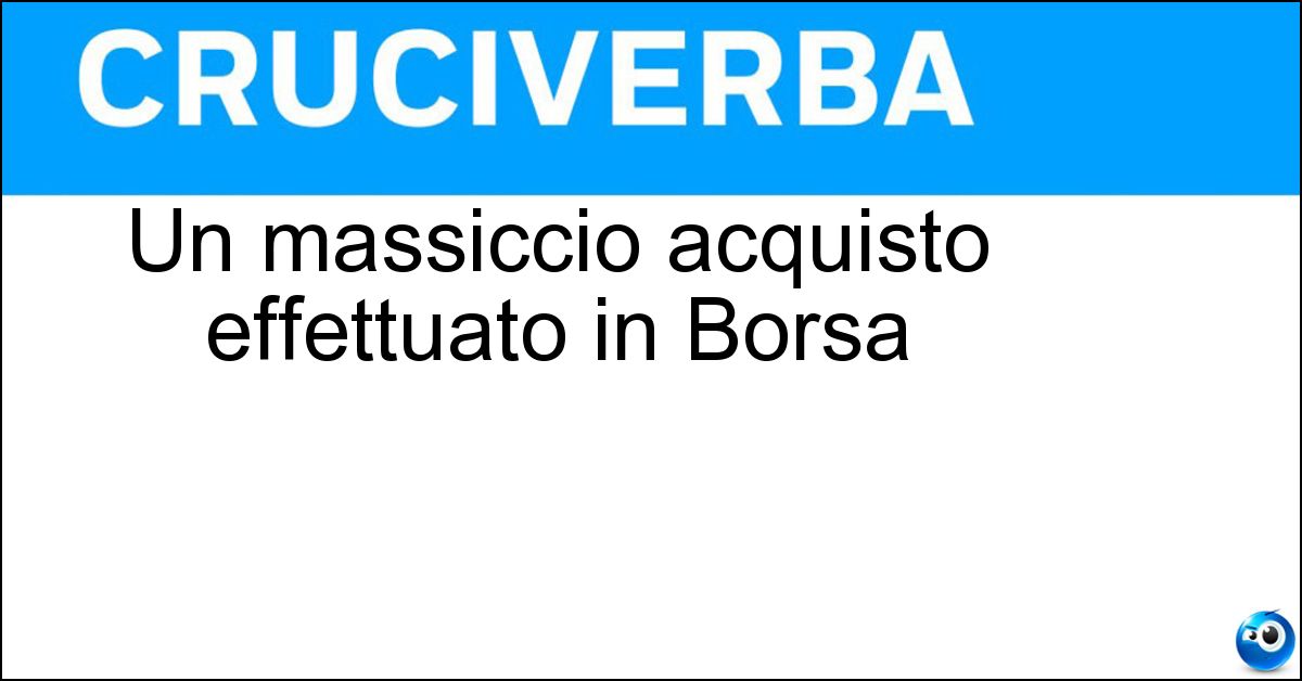 Adesso divertiti e prova a risolvere anche queste definizioni correlate: Un offerta finanziariaL est dell EuropaSi lancia... in BorsaUn massiccio acquisto in BorsaMassiccio acquisto in BorsaTipo di acquisto in BorsaUn acquisto in BorsaUn tipo d acquisto in Borsa