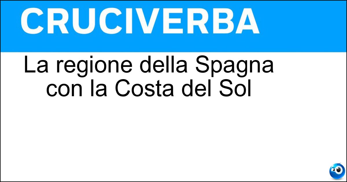 Adesso divertiti e prova a risolvere anche queste definizioni correlate: Regione spagnola con Siviglia e GranadaLa terra del fandangoLa regione spagnola con la Costa del SolCentro balneare della Costa del SolRegione francese fra Costa Azzurra e AlpiLa regione della Costa SmeraldaRegione storica della Spagna